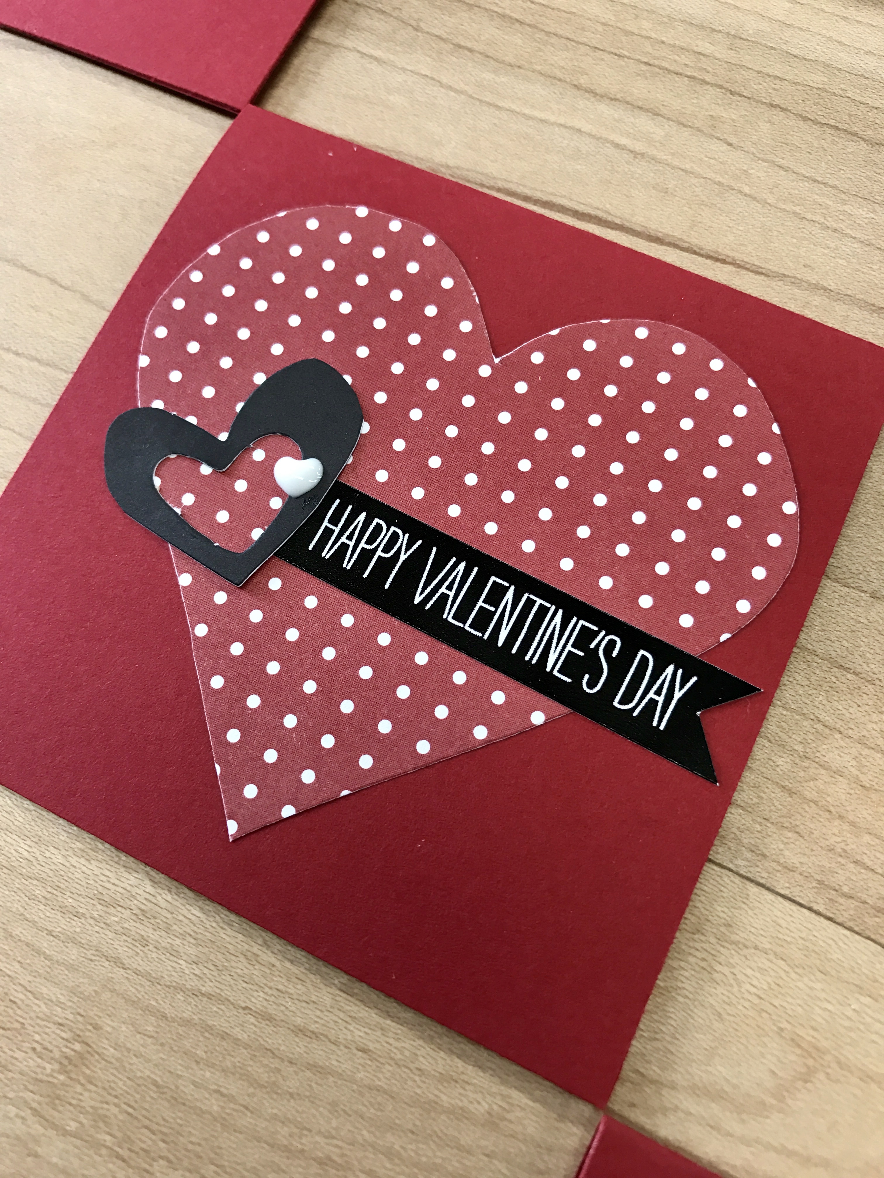 Finally, it was time to play! I had so much fun mixing and matching all of the patterned hearts with the embellishment hearts and flagged sticker greetings! I used some of the little enamel hearts to add another layer to the cards and voila – super cute Valentine’s Day cards whipped up in a snap!