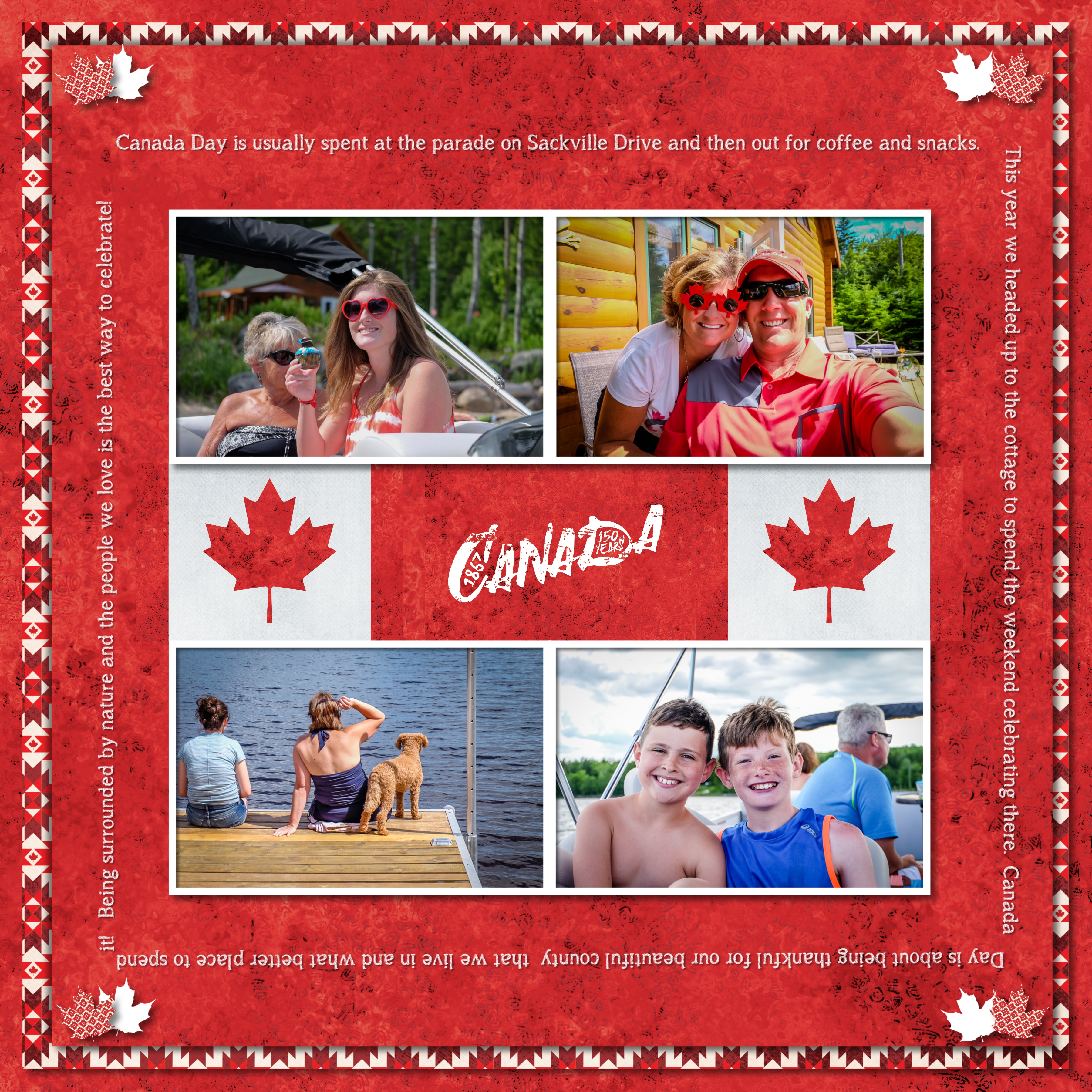 Canada Day celebration photos of course are perfect for this paper pack!  The Canada 150 photo mat will be great for all of our celebrations this summer!  I created the maple leaves with the Nature shapes built into my software program.  I created a text path as well on this page to frame my photos and mats.
