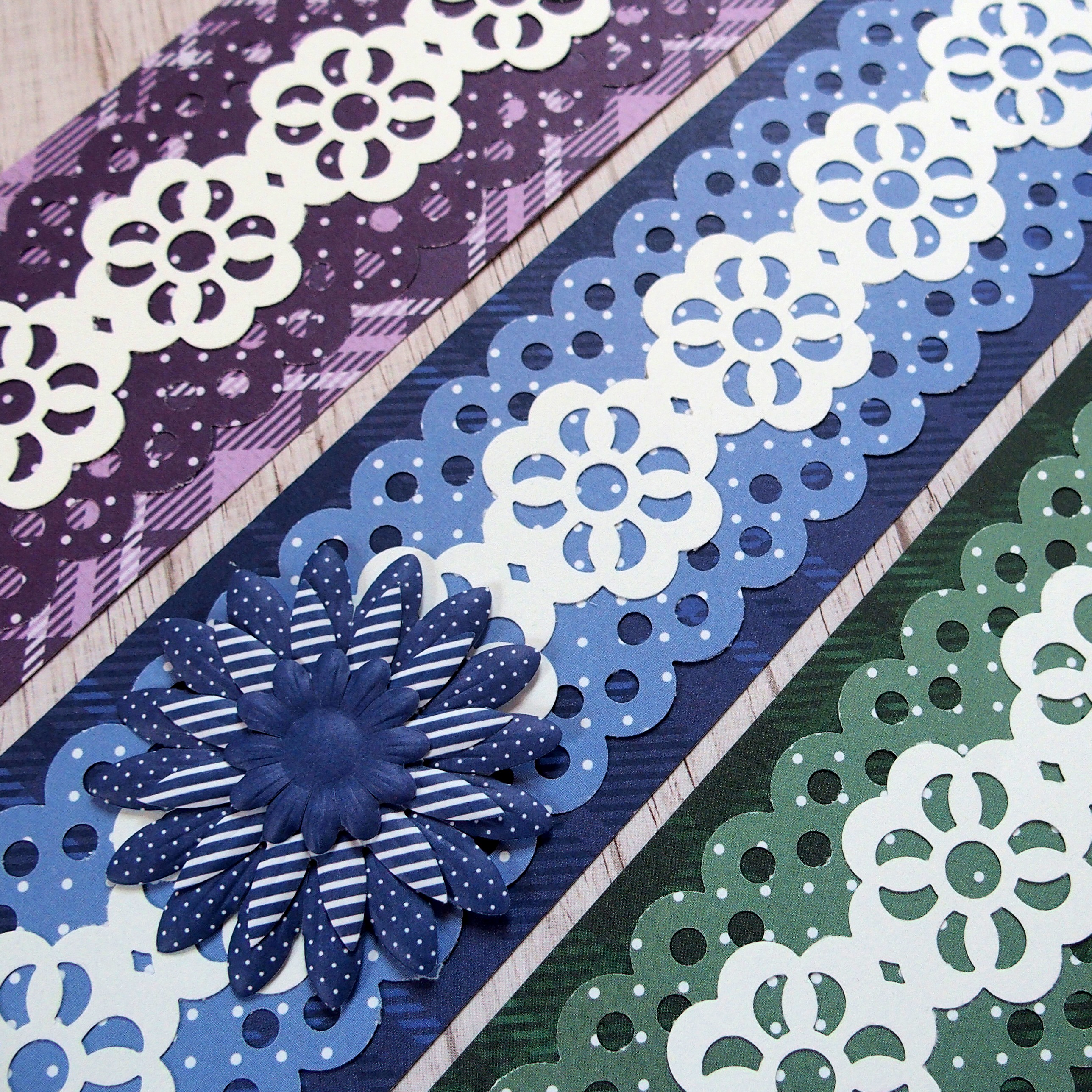 You can easily create any of these borders in a different color just by swapping out paper packs. Shown above, top to bottom: Royal Border 1, Eggplant and Evergreen.