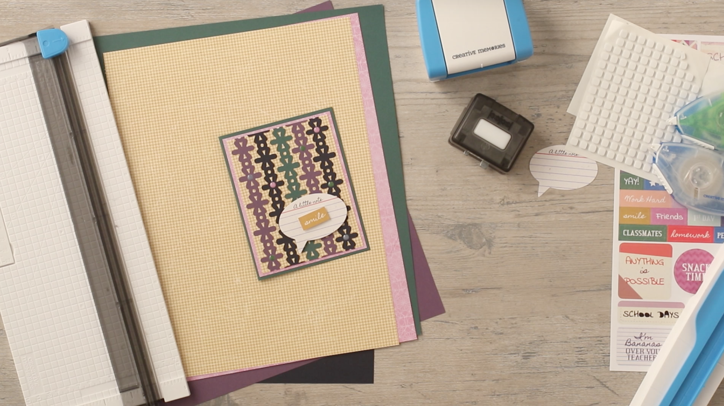 Step 4:  Using the Border Maker System with the Dancing Daisies Border Maker Cartridge, punch three borders; one from Eggplant Cardstock, one from Navy Cardstock, and one from Evergreen Cardstock.  Use Repositionable Adhesive to adhere to the front of the card.  Use scissors to trim away any excess.  Adhere to the front of the card.