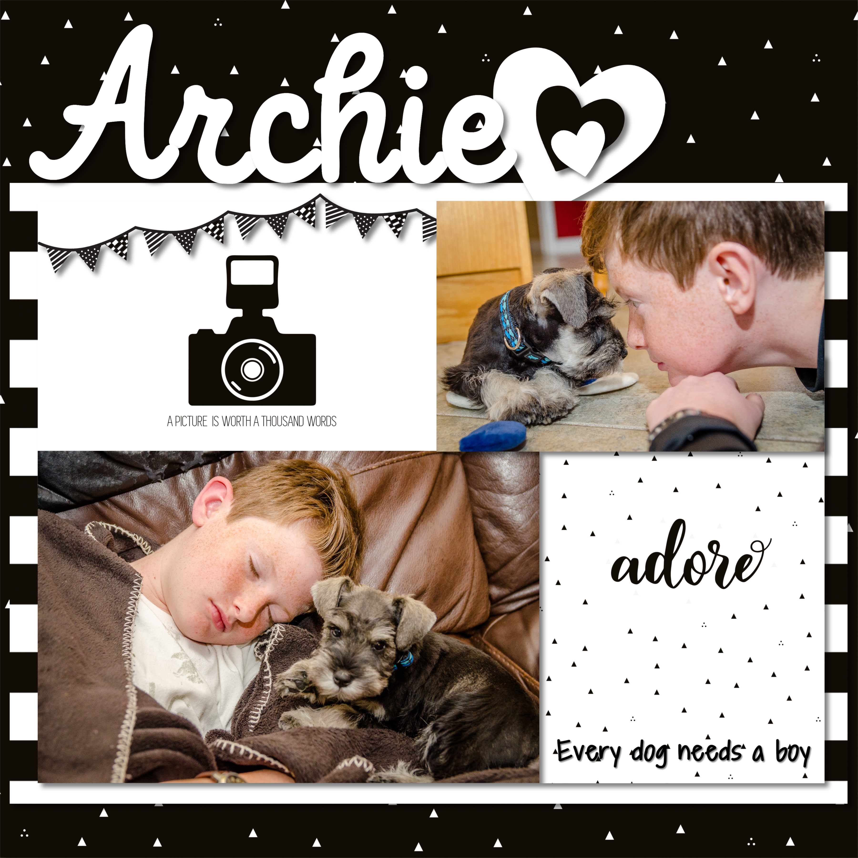 A new black and white puppy calls for a page done with the Black & White Digital Kit. I used the photo mats here to complete the photo blocking.