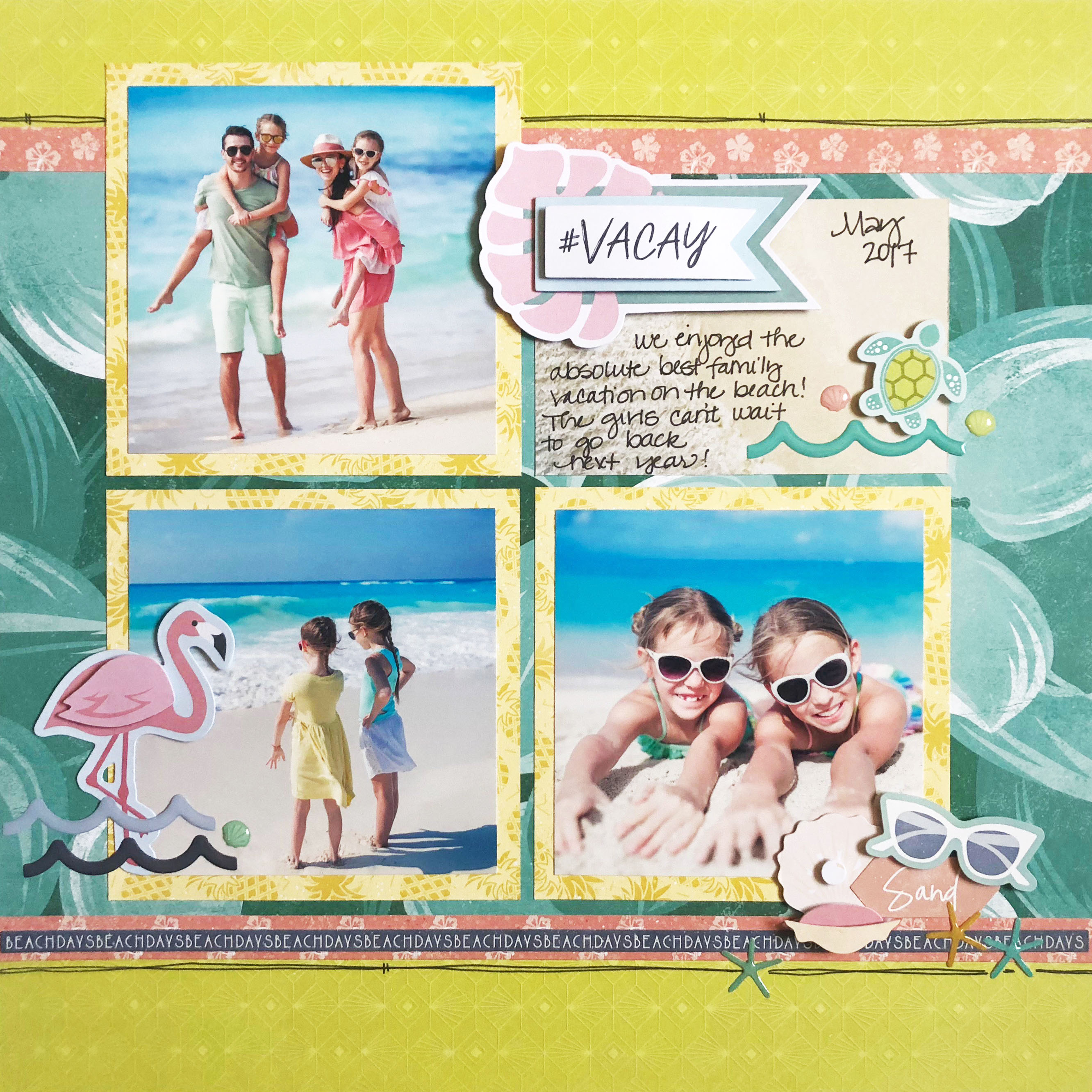 It’s #LaunchDay here at CM, so let’s celebrate the new Sun-Kissed tropical travel collection and tropic like it’s hot with a sizzling layout that will work for photos at the beach, lake and ocean, Miami and Caribbean vacations, fiestas, outdoors, luaus and more. Take a look now at the scrapbook layout we created for your next beach or travel album!
