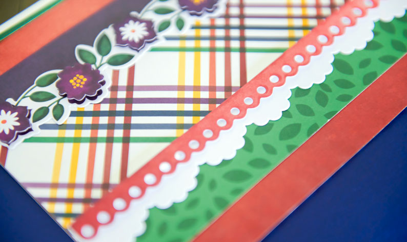 Step 2: Cut a 1″ x 12″ strip of green leaf patterned paper, a 2″ x 12″ strip of striped patterned paper and a 1″ x 12″ strip of green leaf patterned paper. Adhere it on the lower third of the layout as shown. Top it with two layered border embellishments over the seams.