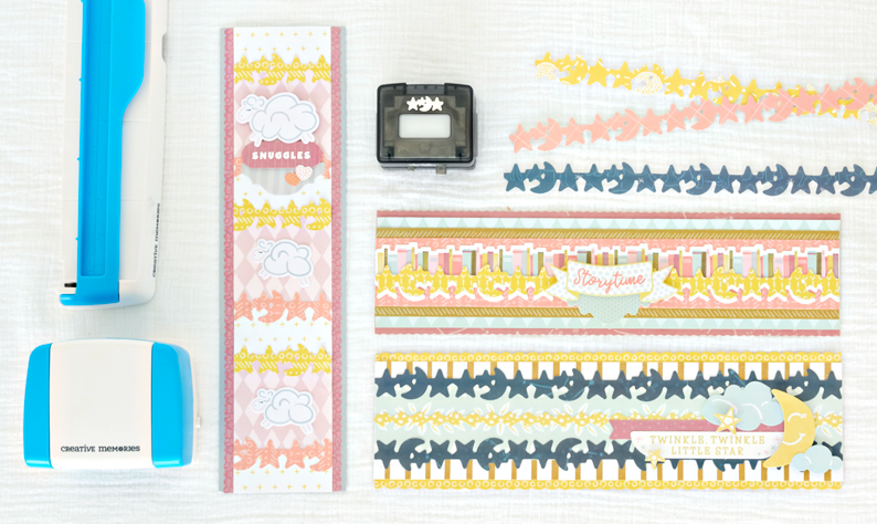 Step 3: Punch two borders using the Moon and Stars Border Maker Cartridge with navy tone-on-tone paper. Adhere them to the top and bottom of the aqua leaves strip as shown.