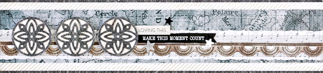 Step 2: Using the 12-inch Trimmer Deckle Blade, cut a 12″ x 1-1/8″ strip of music patterned paper and adhere it on the map patterned paper strip, about 1/8″ from the lower edge. Top it with a scalloped border sticker.