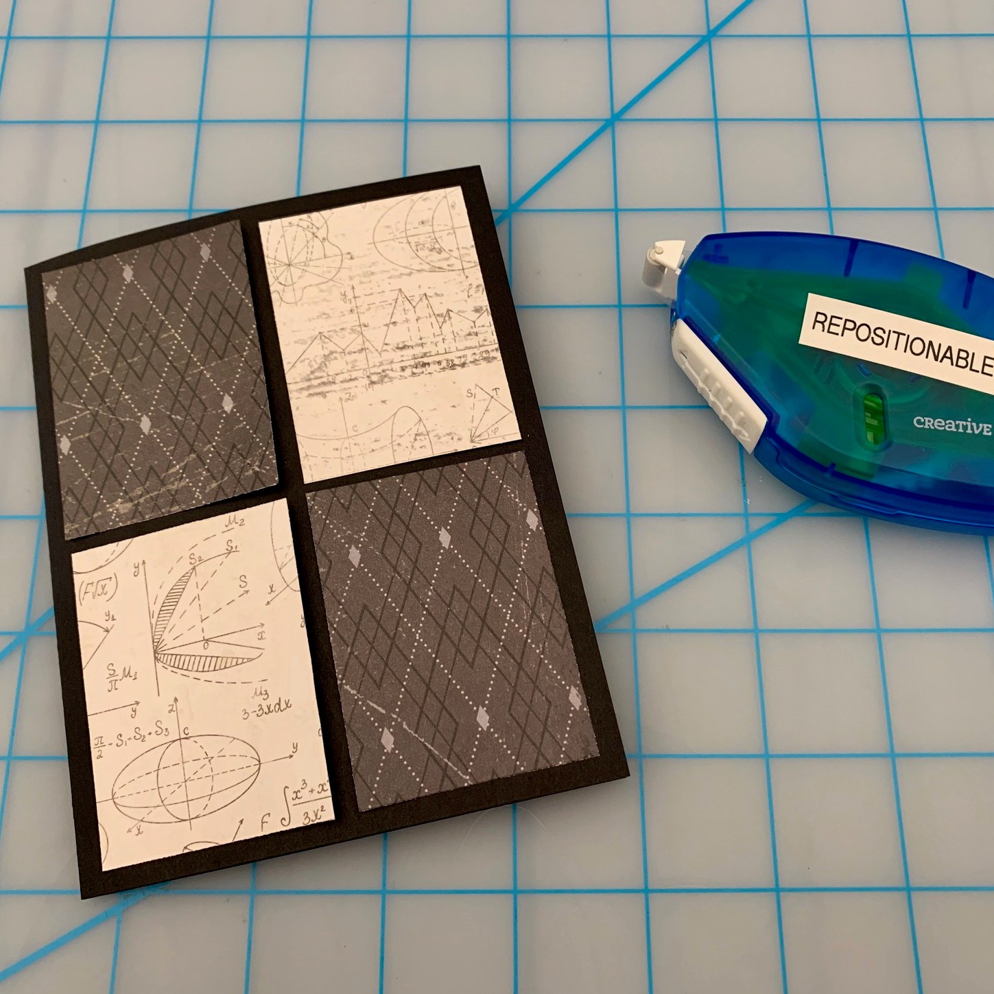 Step 3: Arrange the four rectangles evenly on the card base and adhere the outside corners of each to the card base with the Tape Runner and Repositionable adhesive.