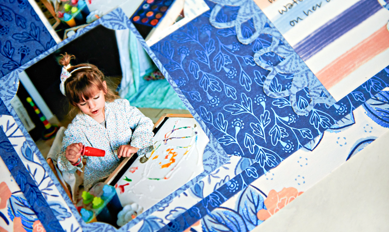 Step 4: Cut two pieces of the blue and white patterned paper to measure 3-1/4″ x 4-1/4″. Notch the corners with the Essentials 4-Way Punch. Crop two photos to measure 3″ x 4″ and insert them into the notches in the blue and white patterned pieces.