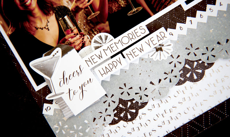 Step 2: Cut a piece from the “cheers” patterned paper to measure 12″ x 3″ and adhere it along the bottom edge of the layout.