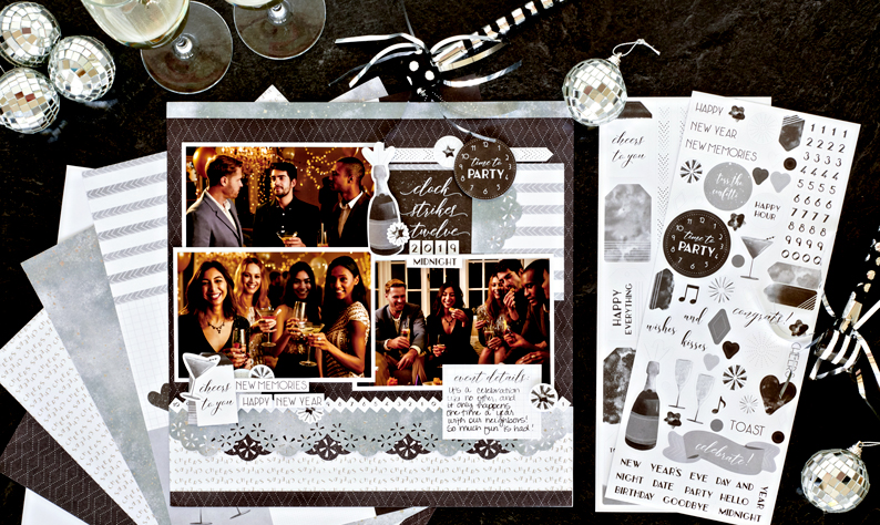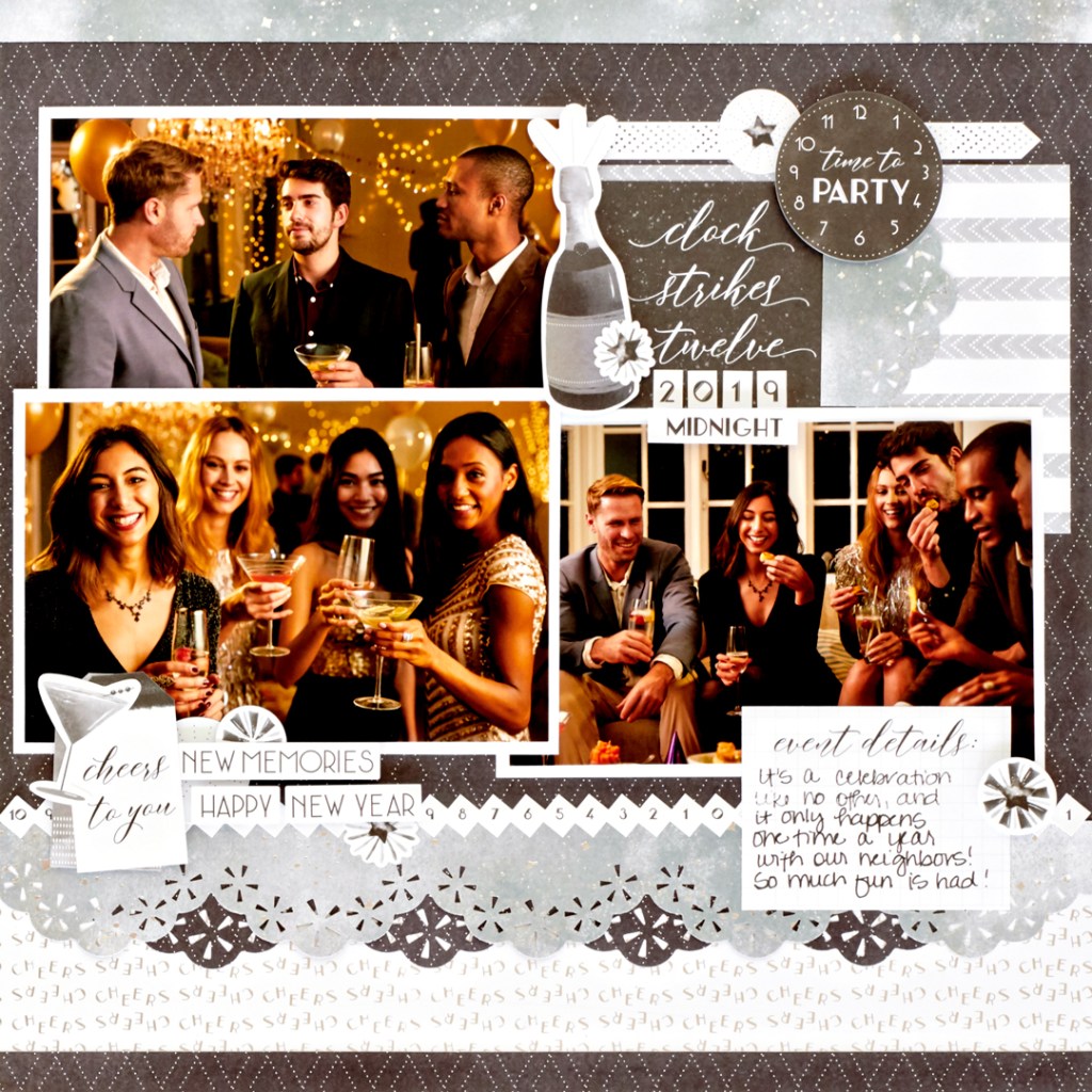 Uncork the midnight magic with the Cheers Theme Pack! Inspired by glitzy downtown parties with champagne and trying to stick to resolutions made, this kit adds fizzy fun to so many projects! Whether you’re saying, “Cheers” to New Year’s, an anniversary or other milestone moments, this celebration scrapbook layout is perfect for your party projects!