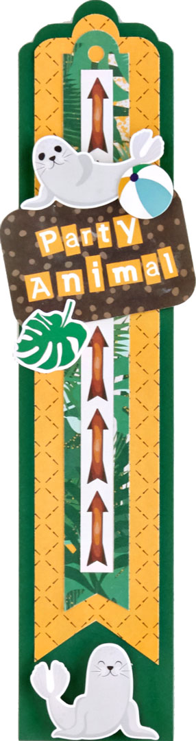Step 4: Trim out the “Party Animals” piece from the mat patterned paper. Use the 2-Way Corner Rounder to round the corners and place it at an angle on the border.