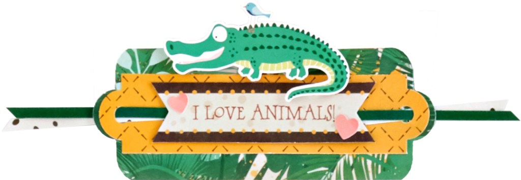 Step 3: Trim out the “I Love Animals” piece from the mat patterned paper. Notch a “v” into both ends with All-Purpose Scissors and adhere it to the middle of the tag. Add alligator and hearts stickers.