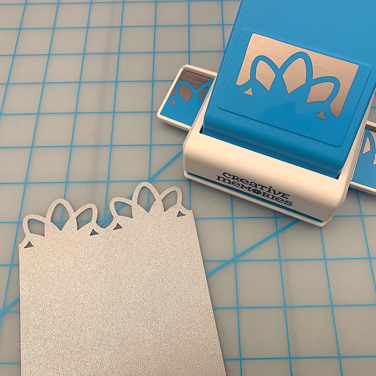 Step 1: You will be cutting and punching one Petal Frame shape to use as the base for each letter of your banner. For “Happy New Year,” you will need 12 squares measuring 4″ x 4″. Make sure to add an extra shape for the beginning and end of the banner, as well as in-between each word. The banner shown above and below uses 16 shapes in total. Cut the number of squares required with the 12-inch Trimmer from Platinum and Bronze Shimmer Cardstock.
