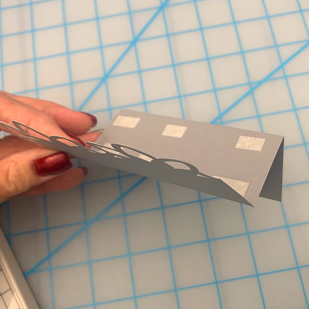 Step 3: Place the 6″ edge of the rectangle along the top edge of the 12-inch Trimmer. With the Scoring Blade in the housing, score the place card at 1-5/8″ and again at 3-1/4″. Accordion fold the card so the petal border is facing the top. Adhere the back of the top fold to the front of the middle fold. You will have a tent card with the petal border at the top. Repeat for each place card required.