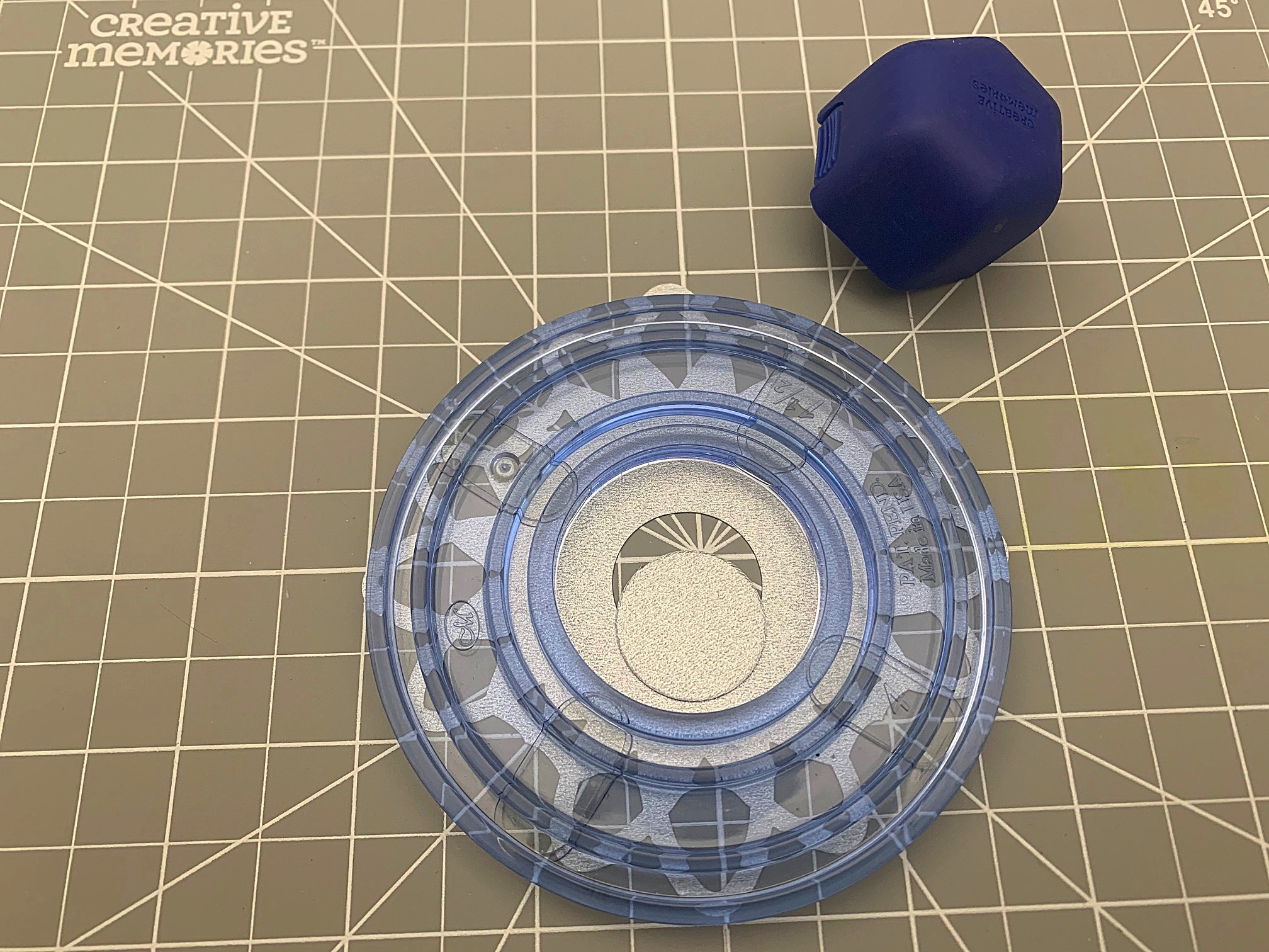 Step 3: Use the Custom Cutting System Mat and the inside of the smallest Custom Cutting System Circle Pattern and the Blue Blade to cut 1″ circles from the middle of each petal frame shape. Use All-Purpose Scissors to cut from the outside edge of the petal frame shape into the middle circle. Repeat for each glass decoration required.