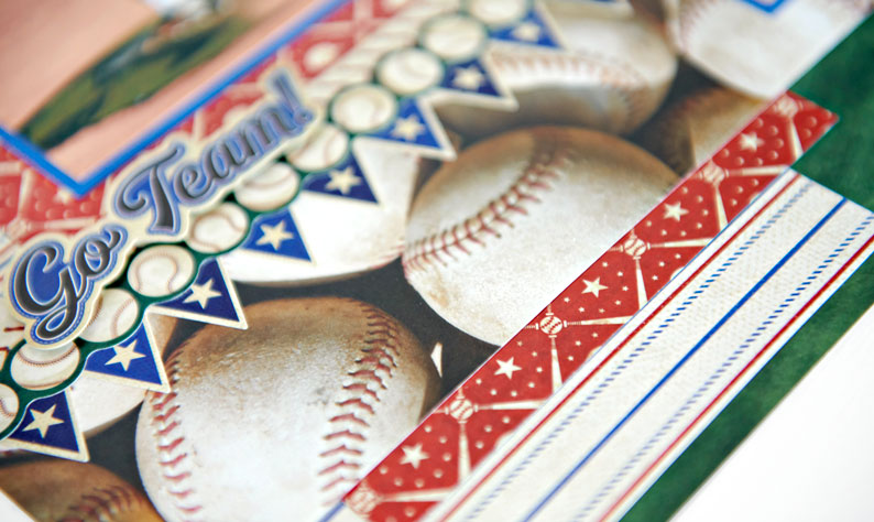 Step 3: Cut a 12″ x 3″ piece of baseball patterned paper and adhere across the layout, with the lower edge about 1-3/4″ up from the bottom edge. Adhere and layer border stickers along the top edge of this piece, as shown.