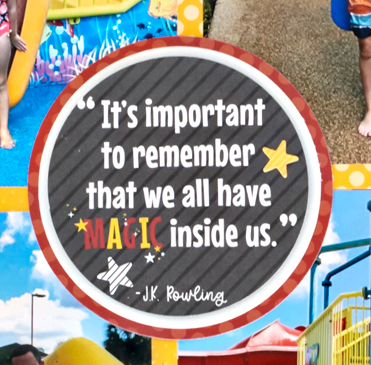 Step 6: Using the inside of the largest Custom Cutting System Circle Pattern and the Blue Blade, cut the quote from the mat that says, “It’s important to remember that we all have magic inside us.” Place the striped mat with a hole cut out over the middle photo.