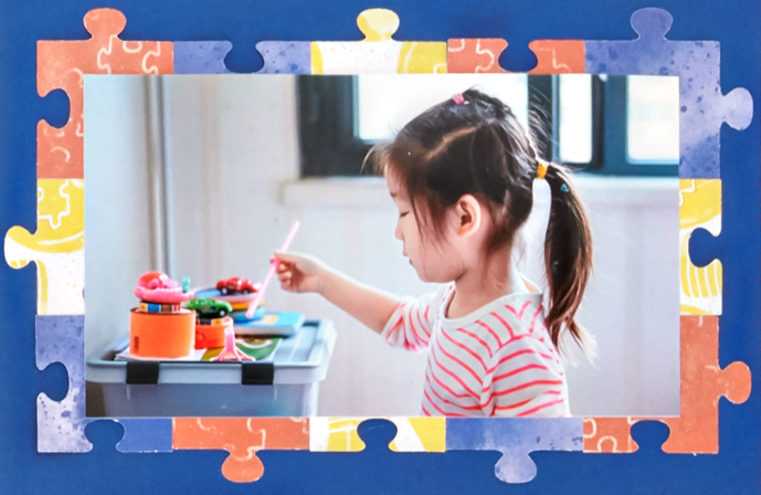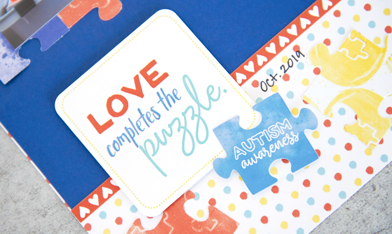 Step 5: Adhere the remaining puzzle pieces along the bottom section of the layout, along with the “Love Completes the Puzzle” and “Autism Awareness” stickers, popped up with Foam Squares.