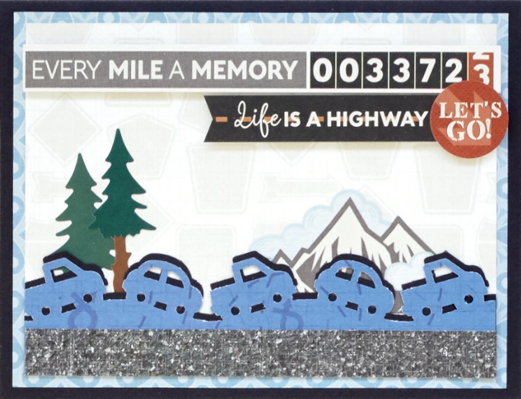 Step 2: Using the On the Road Border Maker Cartridge, punch along the edge of the blue patterned paper. Cut to measure 2-1/4″. Adhere along the bottom edge of the border.
