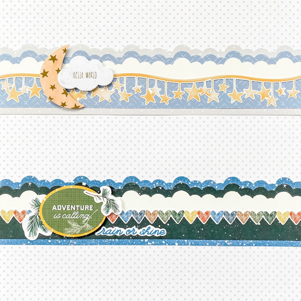 Next, I paired the Clouds Border Maker Cartridge with the Little Dreamer collection for a sweet baby border. When I recreated the same border using the S’more Memories collection, it became a night sky adventure!