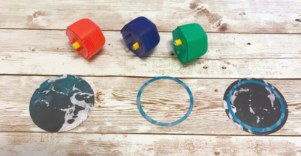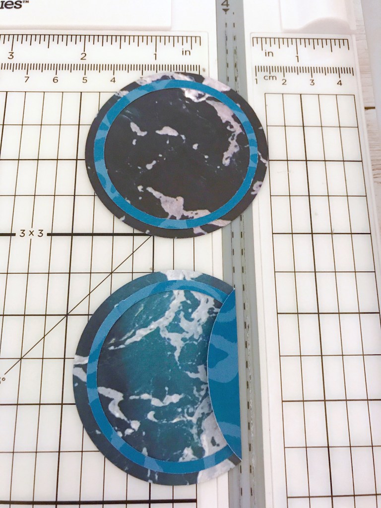 Step 3: Cut four circles using the inside of the medium Custom Cutting System Circle Pattern with the Red Blade from the ocean patterned paper. Using the same Circle Pattern and the Blue and Green Blades, cut four rings and four circles.