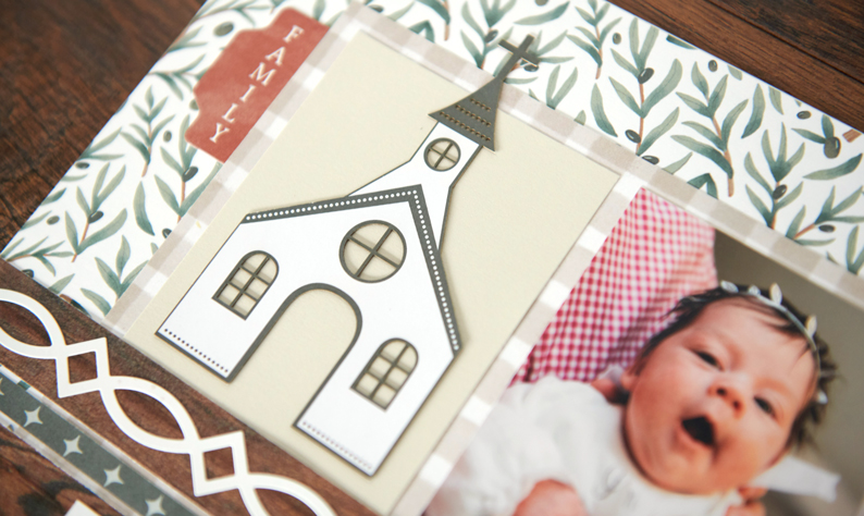 Step 1: Use a sheet of olive branch patterned paper as the base for this layout. Cut a sheet of gingham patterned paper to measure 9-1/2″ x 9-1/2″ and mount on the base.