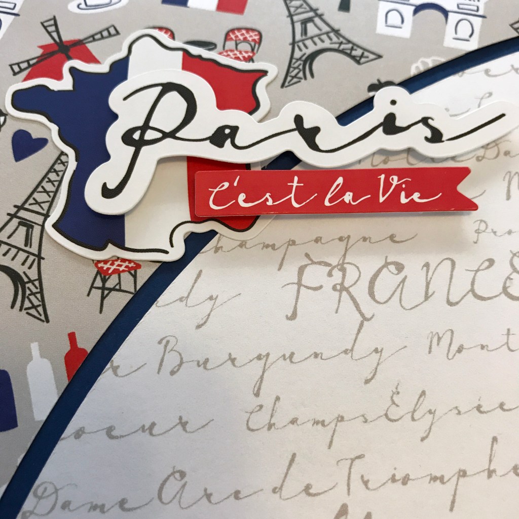 Step 1: Adhere the Paris icons patterned cut out made from previous layout to the base. Add the Paris-themed words circle in the middle as shown.