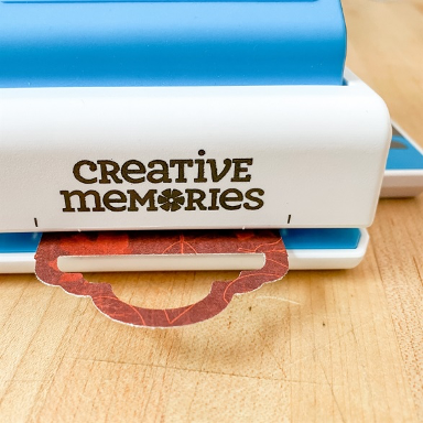Step 3: Line a piece of green designer paper up at an outside mark of the Arch Border Frame Punch. Punch a border and trim out to 12″ x 1-3/4″. Adhere near the bottom of the base and mount a 12″ x 3/4″ strip of leaves designer paper. (Tip: Save the punched out “tab” pieces to use to make the Falling for You Border.)