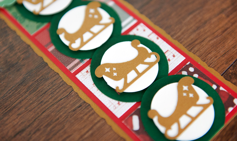 Step 9: Using Santa’s Sleigh Punch, punch six pieces from the Bronze Shimmer Solid Cardstock. Adhere to the middle of each circle.