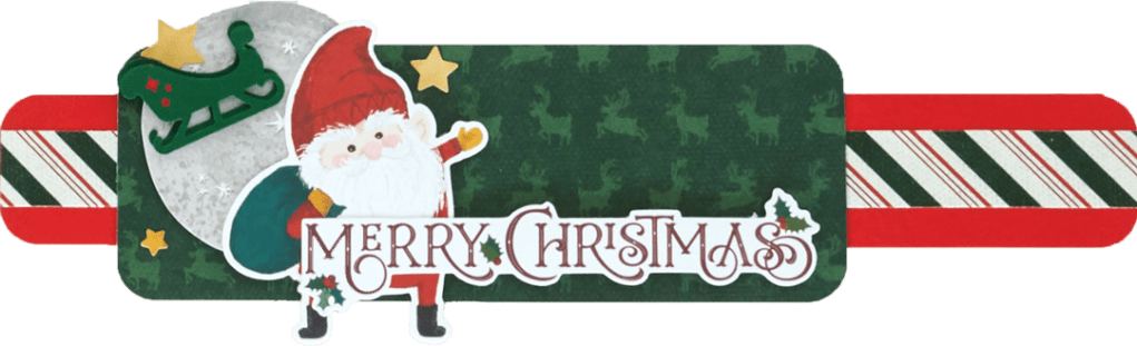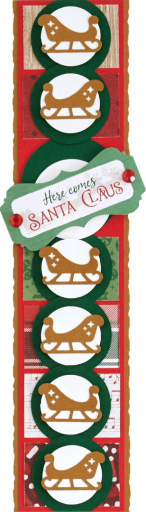 Step 4: Punch two pieces using Santa’s Sleigh Punch from Scarlet Solid Cardstock. Cut the legs off the elf die cut and adhere behind one of the sleighs. Adhere one sleigh to the border, then adhere the one with the elf slightly off-set using Foam Squares so it appears the elf is in the sleigh.