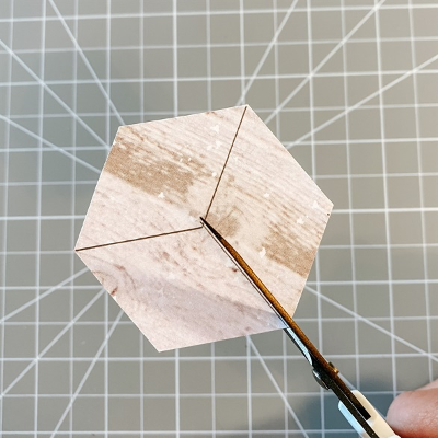 Step 2: Cut the inside 11″ x 11″ from two sheets of wood grain patterned paper. Adhere these 1″-wide frames to the cardstock base pieces. From each of the inside 11″ x 11″ squares, cut two 6-1/2″ x 4-1/2″ pieces. Reverse to the green plaid side to create photo mats for four 6″ x 4″ photos.