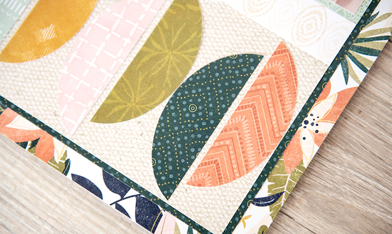 Step 4: Using the inside of the largest Custom Cutting System Oval Pattern and the Green Blade, cut ovals with several patterned papers. Cut each in half lengthwise. Trim about 1/4″ off the straight edge of each. Adhere 10 halves on the layout as shown.