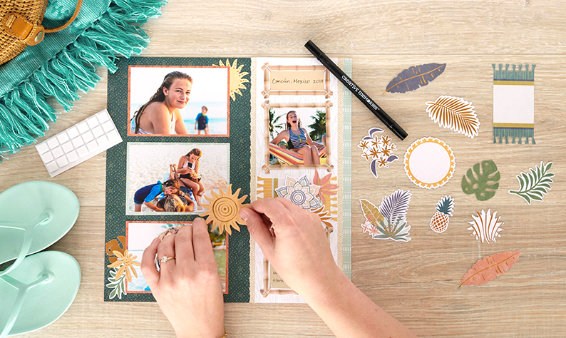 It may be early in the year, but who is already feeling like they could use a tropical vacation? Whether you have a trip planned in the near future or want to reminisce on one from year’s past, this softly super vacation scrapbook layout is just what you need to seas your tropical moments and turn them into a sun-filled (and fun-filled! craft adventure. Bring on the sunscreen… and your creativity!