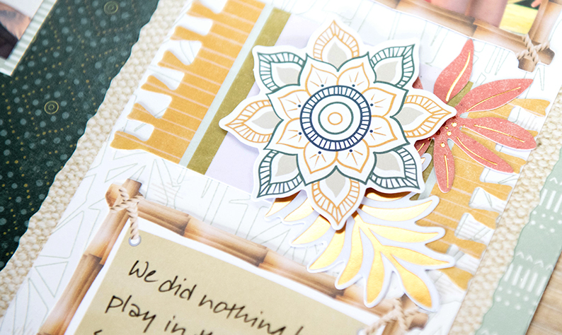Step 4: Adhere three bamboo frame embellishments and one rug embellishment to the layout as shown. Add additional foiled embellishments, popping some up with Foam Squares for added dimension.