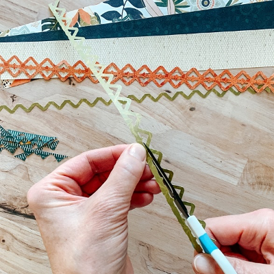 Step 2: Using the Mirrored Triangles Border Maker Cartridge, punch one border from each olive, dark teal stripe and terra cotta papers. Using just the punched out pieces of the dark teal border (save the actual border for one of the following borders), adhere them behind the terra cotta border so the dark teal shows through the triangle cutouts. Trim off the middle bar section of the olive border so just the two zigzag sections remain. Attach each to the top and bottom of the terra cotta border, trimming as necessary, and mount on the border.