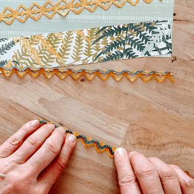 Step 1: Cut a 12″ x 2-3/4″ strip of mint stripe tonal paper for the base. Cut a 12″ x 1-1/2″ strip of ferns designer paper and adhere to the top section of the base.