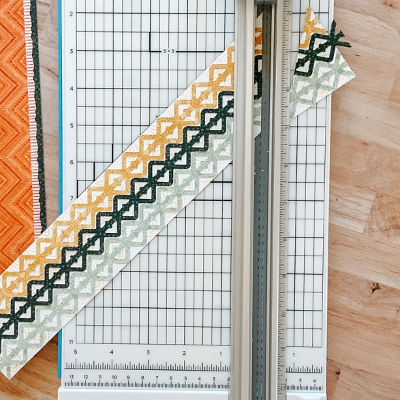 Step 1: Cut a 12″ x 2-3/4″ strip of dark teal dotted designer paper for the base. Using the 12-inch Trimmer with the Deckle Blade, cut a 12″ x 2-1/2″ strip of salmon pink stripe tonal paper and adhere on the base. With the 12-inch Trimmer with the Straight Blade, cut a 12″ x 2″ strip of terra cotta chevron designer paper and mount on top.