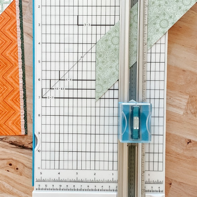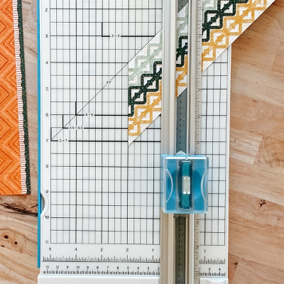 Step 3: Using the photos below as a guide, align the strip on the trimmer using the 45-degree line and cut off one corner. Rotate and align the straight edge at 2″ and cut at the same angle. Flip the strip to the back side and repeat.