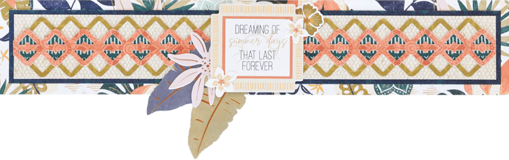 Step 1: Cut a 12″ x 2-1/4″ strip of tropical floral designer paper for the base. Cut an 11-1/2″ x 1-3/4″ strip of navy tonal paper and align and adhere it to the middle of the base. Cut an 11-1/4″ x 1-1/2″ strip of tan canvas designer paper and mount on top.