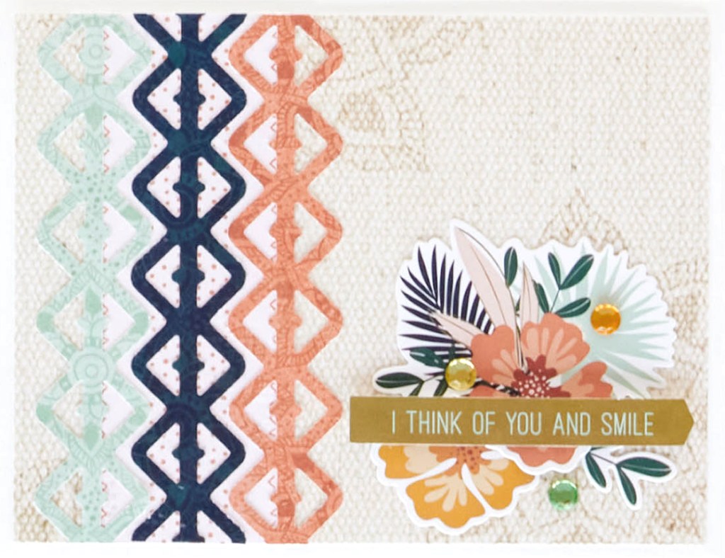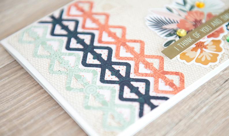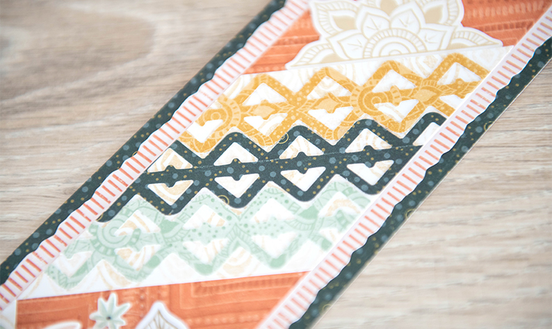 Step 3: Punch a border using the Mirrored Triangles Border Maker Cartridge from each mint, navy and terra cotta mandala tonal papers. Adhere side by side and nestled together along the salmon pink strip as shown. Trim edges as needed and adhere the tan canvas mat to the front of the card.