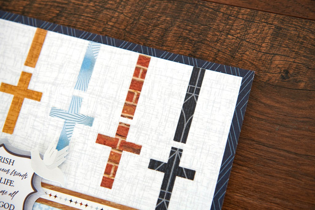 Step 3: Layer and adhere two sticker borders in-between the two pieces sky blue crosses and navy diamonds papers.