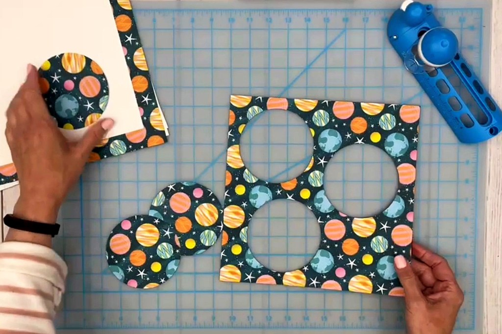 Step 2: Use the Circle Cutter to cut three 4″ circles from the 10″ square. The 10″ square with circular “holes” and all three circles will be used in the layout.
