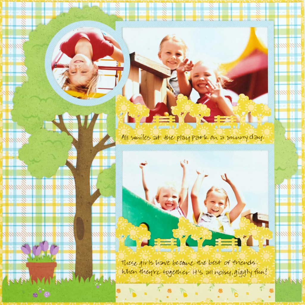 Step 3: Using the Walk in the Park Border Punch, punch a border from sunshine yellow suns paper. Trim to 6-1/4″ x 2″ and adhere to the laser-cut paper, just beneath the top photo. Punch another border, trim to 6-1/4″ x 2-1/2″ and adhere to the laser-cut paper, just beneath the bottom photo. Cut a 6-1/4″ x 3/4″ strip of fresh flowers paper and adhere just below it.