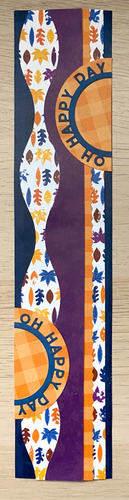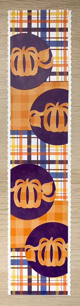 Step 5: Adhere the pumpkin strip to the eggplant leaves paper, leaving a 1″ strip of eggplant leaves paper below the pumpkins.