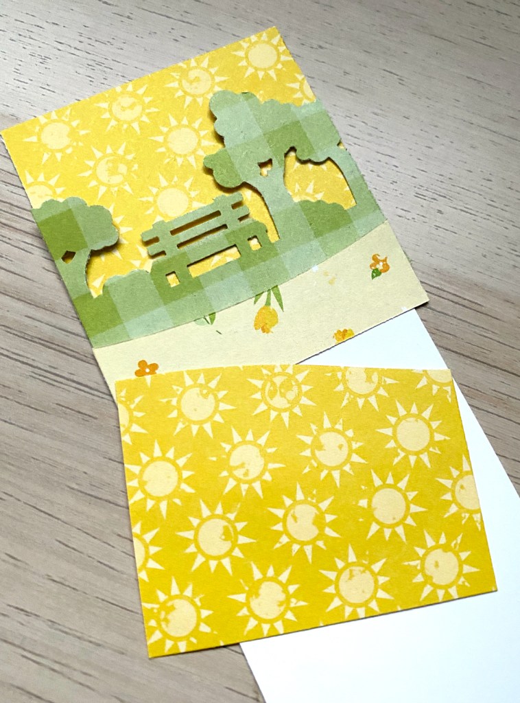 Step 3: With the yellow sunshine suns paper used to create the border strips, cut a 4″ x 2-1/2″ rectangle.