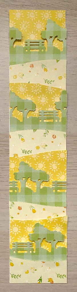 Step 9: Moving down the strip, adhere the park bench punch piece so that it overlaps the sun paper and does not show any white underneath.