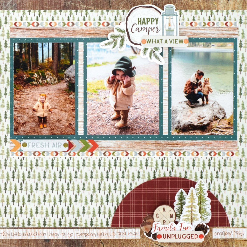 From wonderful waterparks, beautiful beach days, zestful trips to the zoo and other fun activities, there are so many awesome family vacation ideas out there. But another standout option — camping! Camping is a great way for family members to reconnect with each other (and with nature!) and to relish new experiences. (Bonus: It’s a great excuse to enjoy lots of melty s’mores and other delicious campfire eats!) Pack your craft bag and let’s go on an adventure with this camping scrapbook layout!