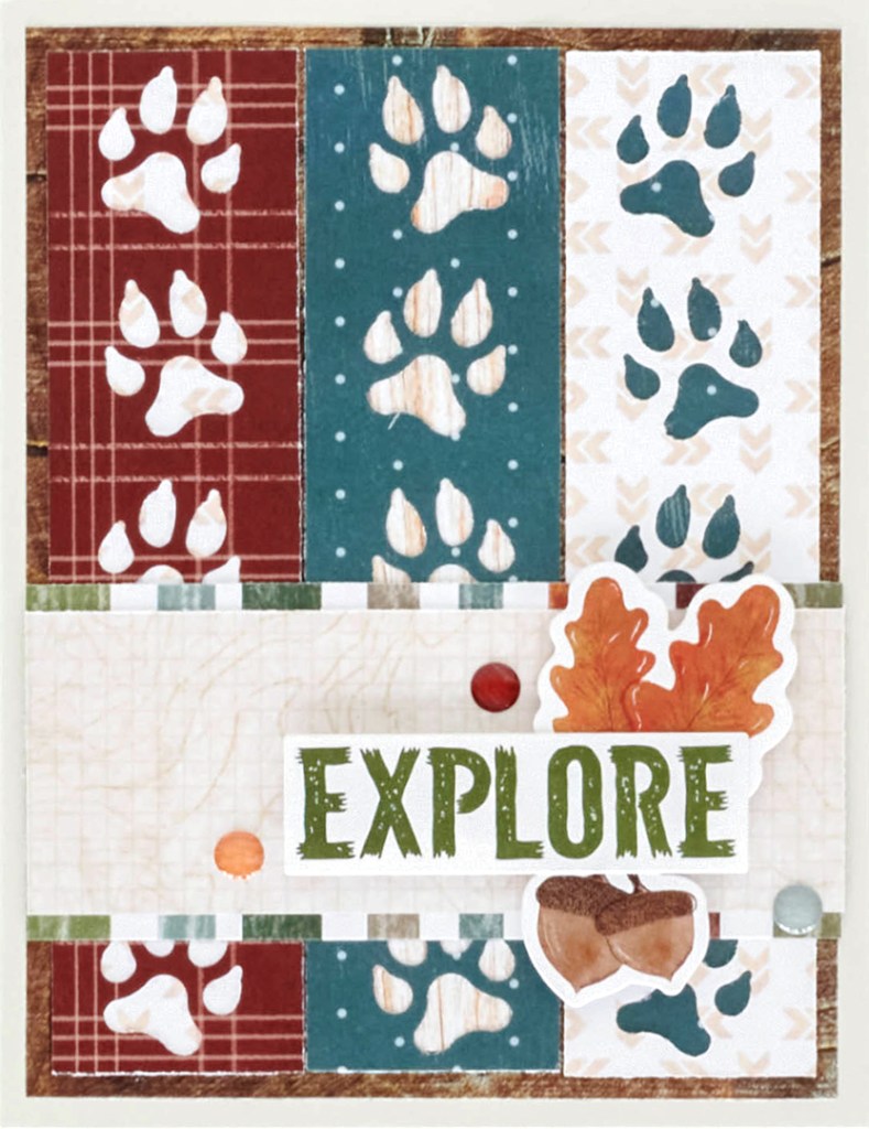 Step 4: Cut three strips of paper from different shades and patterns to measure 1″ x 5″. Place behind the punched animal tracks. Adhere strips to the front of the card.