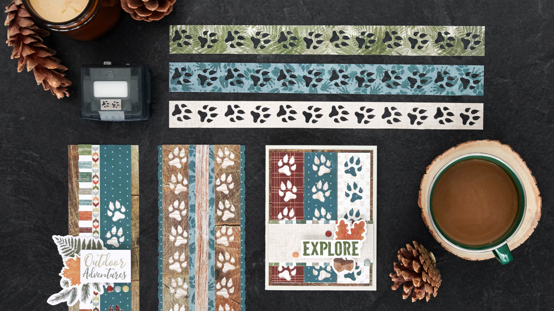 Lions and tigers and bears, oh my! Animals are everywhere in this world, from snow-covered mountains to the thick depths of a forest and even your very own backyard! Animals are awe-inspiring, and if you have photos and memories regarding to hiking, nature walks, trips to the zoo and camping (especially when paired with the Happy Camper collection, like these animal tracks crafts do!), then the Animal Tracks Border Maker Cartridge is a paw-some tool you’ve got to add to your craft room! Go wild!