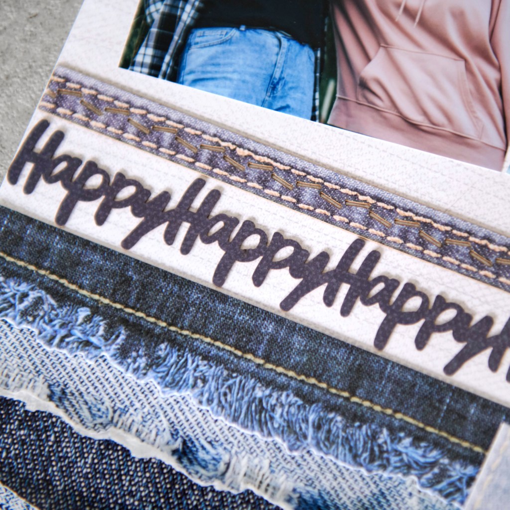 Step 3: Place a frayed denim laser-cut border on top of the layered strips. Above that adhere the “Happy” laser-cut border and then the denim stitched band laser-cut border.