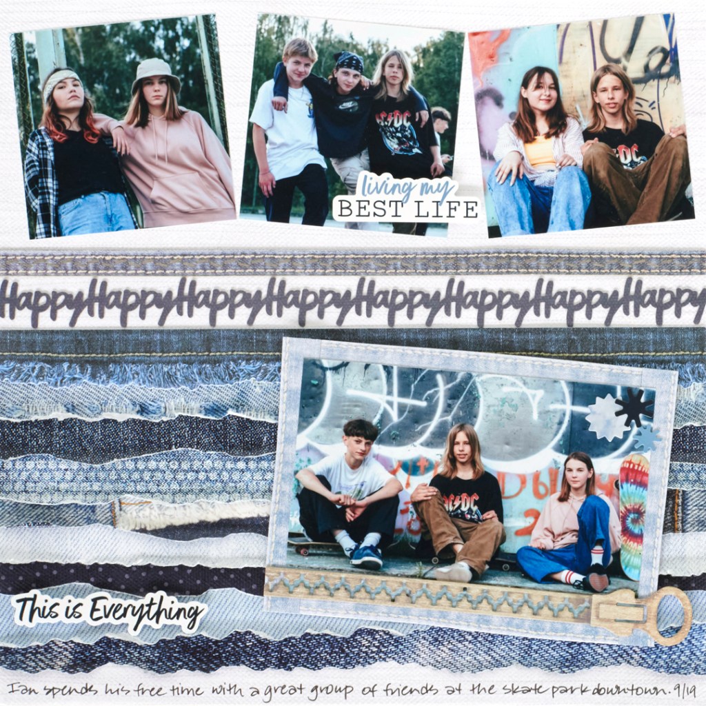 Step 4: Crop three photos to 3-1/2″ x 3-1/2″ and adhere toward the top of the layout. Cut a wide denim band laser-cut border in half lengthwise and then into sections to mat a 6″ x 4″ photo. Cut the zipper laser-cut border to 7-1/4″ and adhere to the bottom as shown. Mount the matted photo to the layout using Foam Squares.